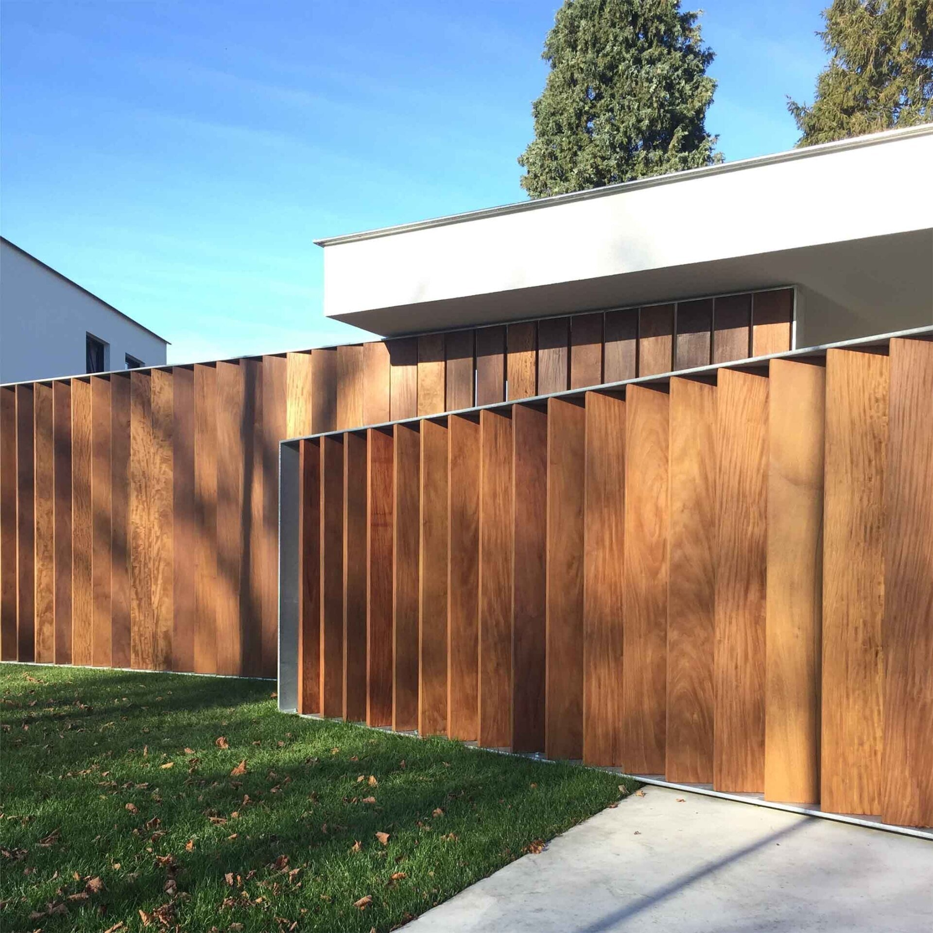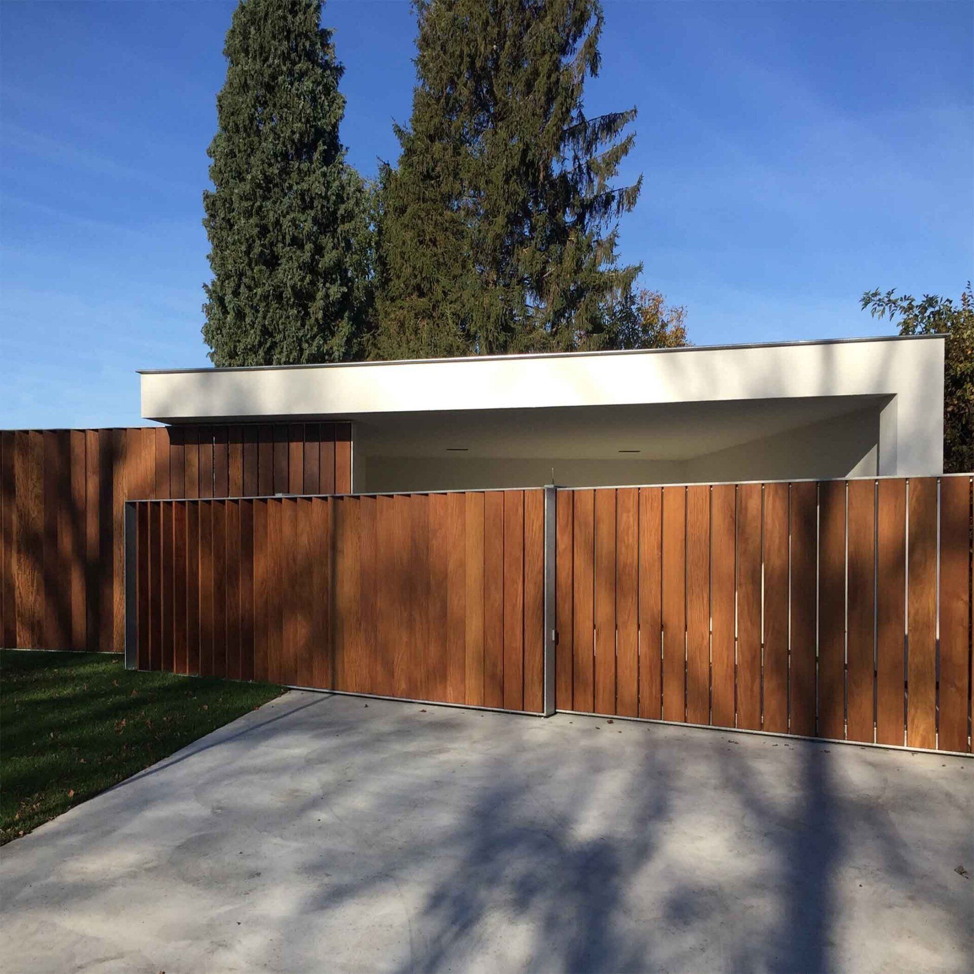 De poort, de omheining, de carport, de tuinberging en het terras in een geheel met het bestaande woonhuis