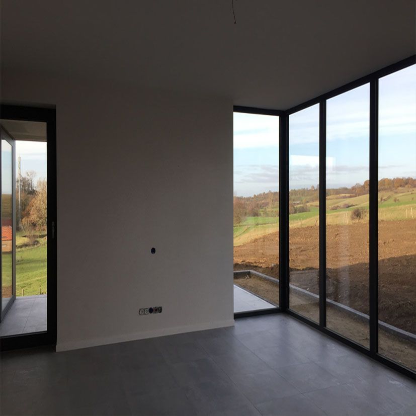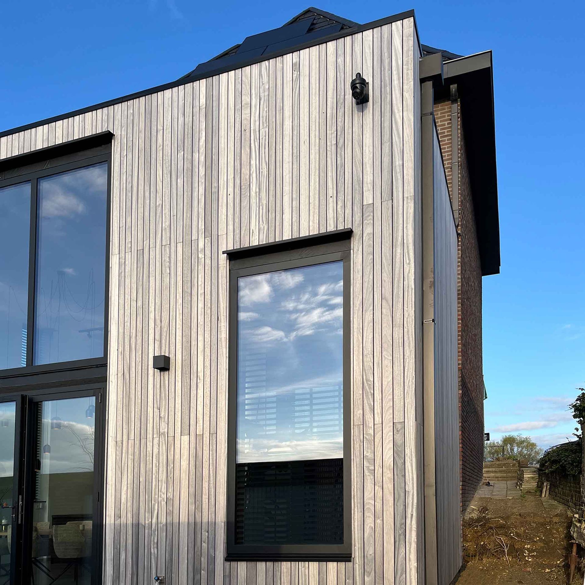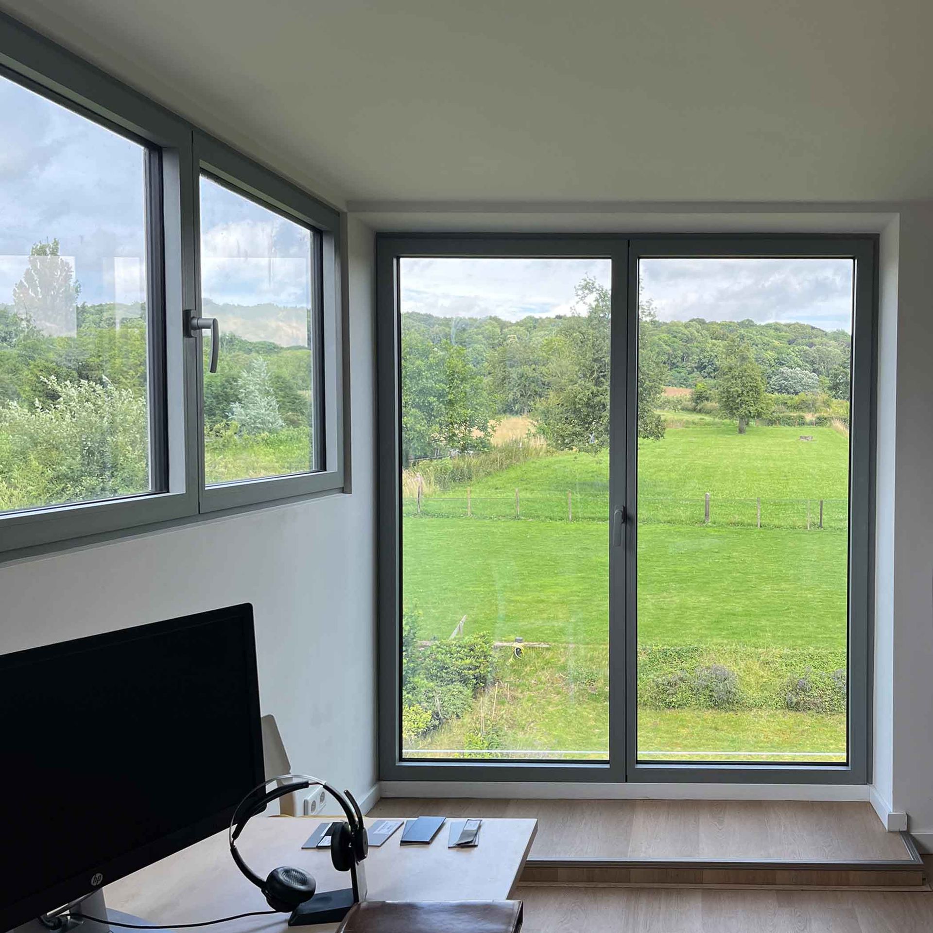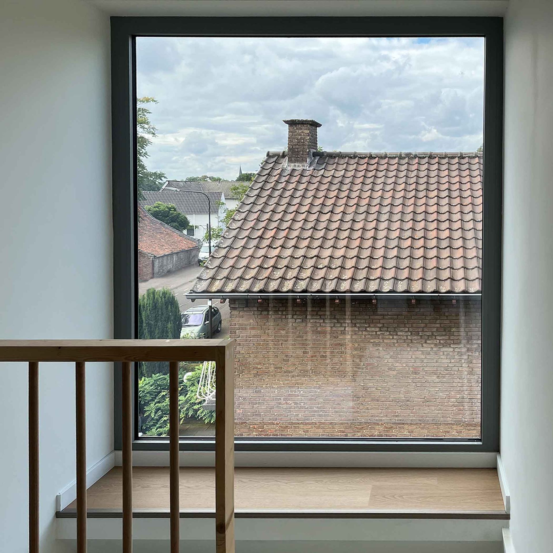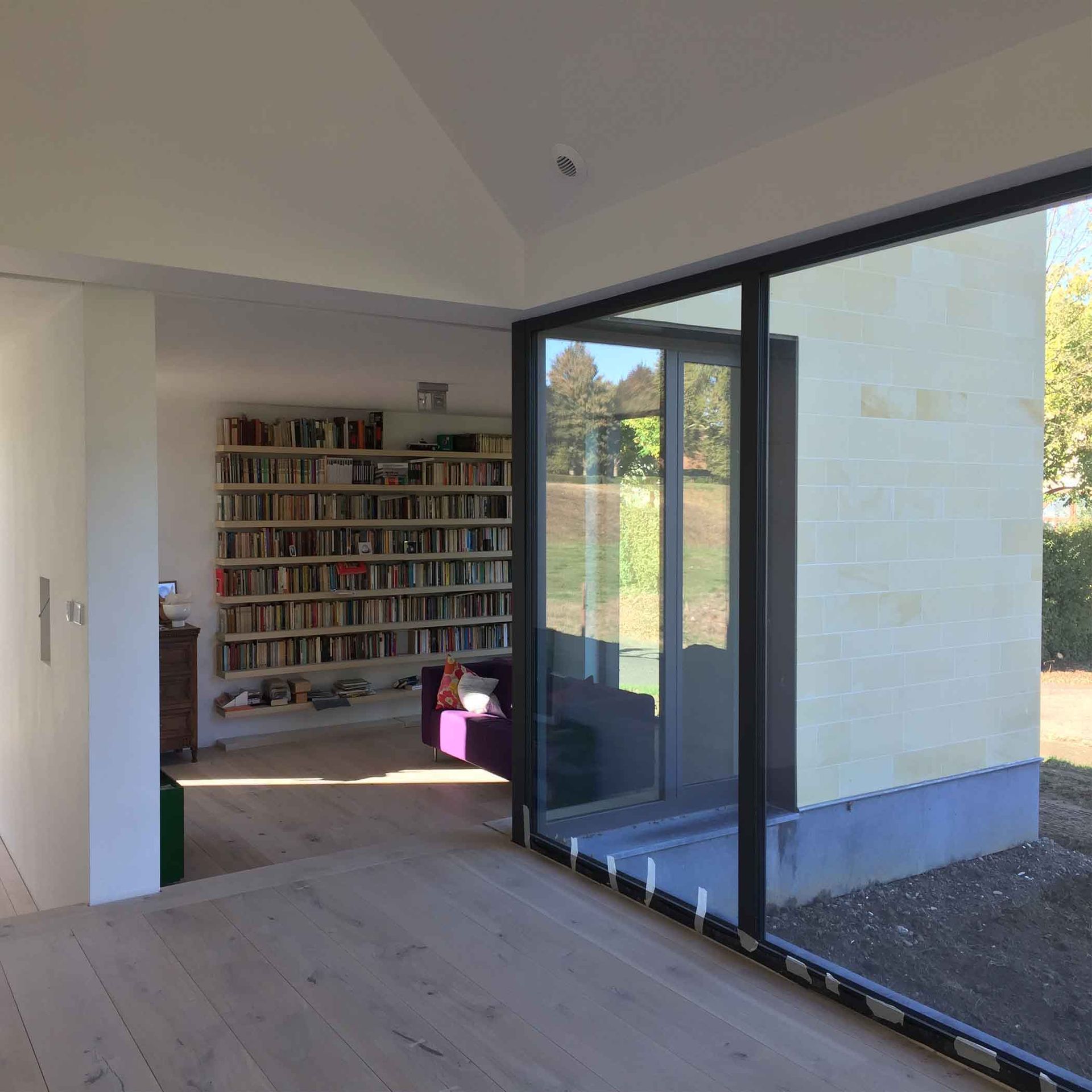 De kozijnen en de pui in de aanbouw zijn van aluminium. In de bestaande woning zijn de kozijnen tot aan de vloer doorgetrokken en vervangen door houten openslaande deuren.