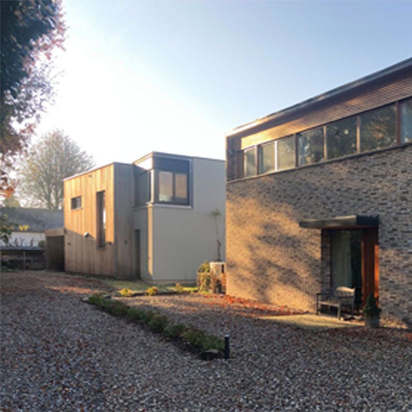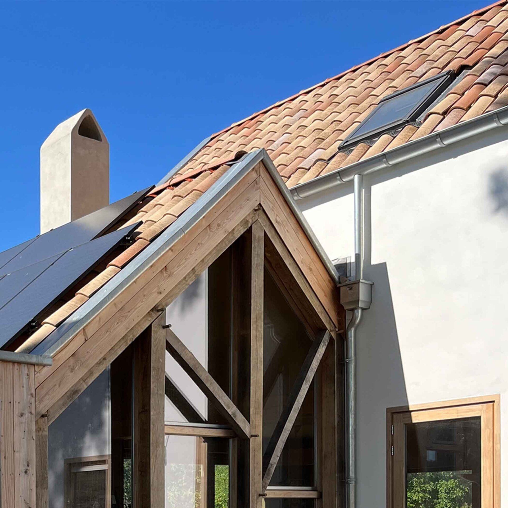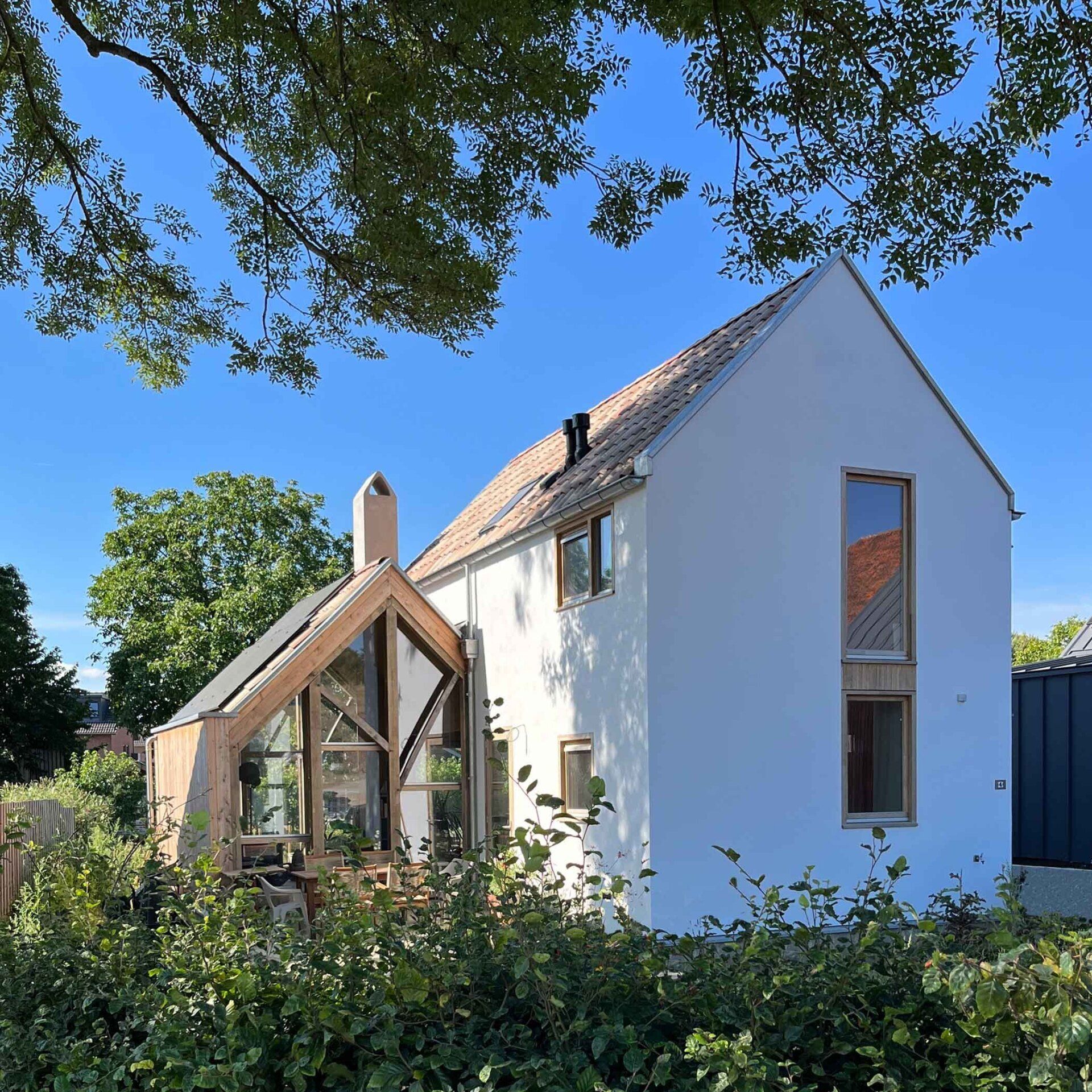 Deze woning heeft doormiddel van een aanbouw aan de zij-en achtergevel een grotere leefkeuken gekregen. Grote puien geven een mooi doorzicht naar de voor en achtertuin. Op de aanbouw is aan de achterzijde de verdieping vergroot met plek voor er een extra slaap-met badkamer. De nok van het dak is verhoogd, waardoor ook op deze verdieping 2 mooie ruimten zijn ontstaan. De bestaande raamopening is doorgetrokken en loopt over in een speciale dakkapel. De hele woning is ingepakt met isolatie en voorzien van aluminiumkozijnen en puien met driedubbele beglazing. Dit in combinatie met zonnepanelen en een warmtepomp zorgt voor een energieneutrale woning