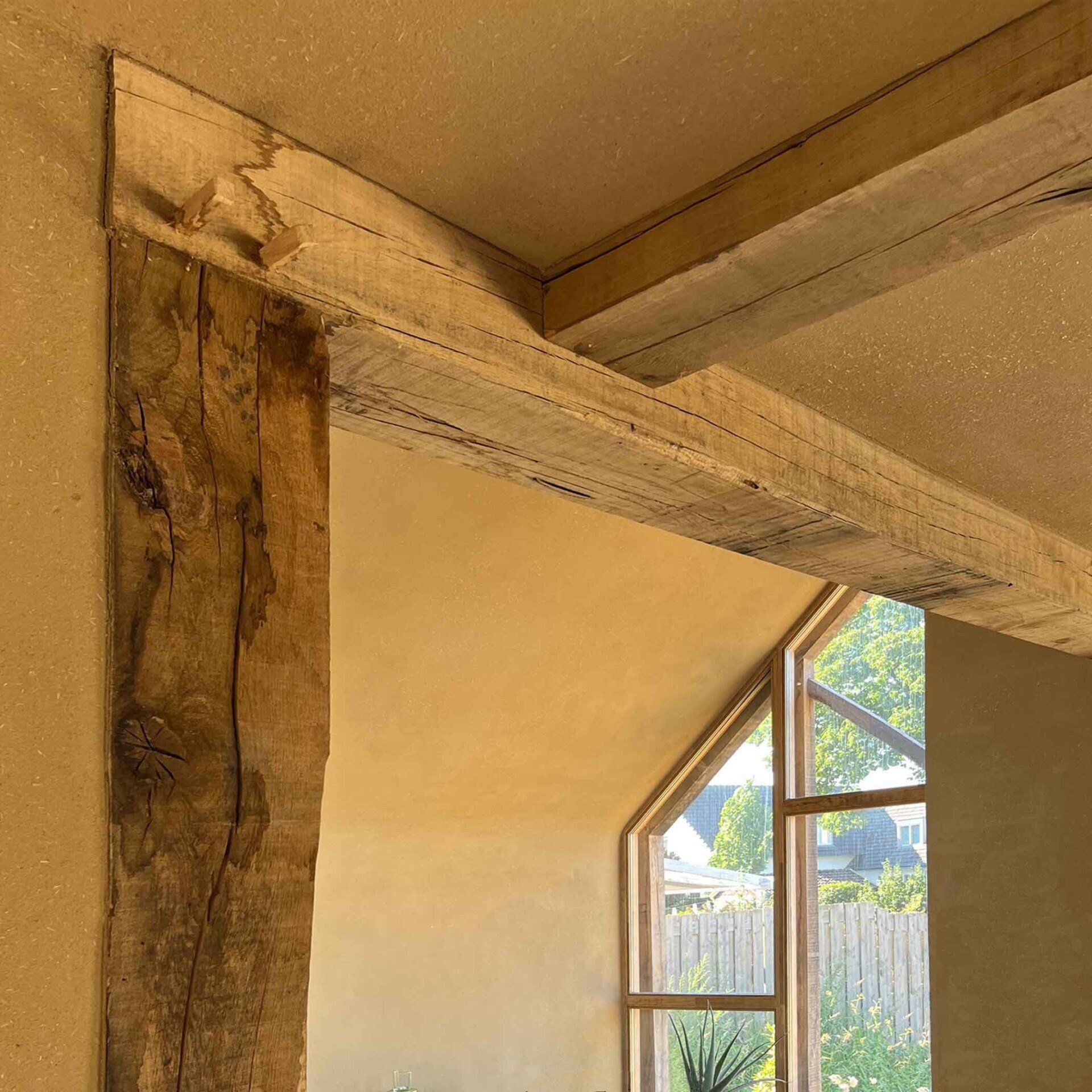 Dit vakwerk woonhuis is geheel opnieuw opgetrokken op een originele stijl waarbij gebruik is gemaakt van hedendaags vakwerkmaterialen: eikenhouten vakwerk met staken, vlechtwerk van wilgentwijgen, vakwerkleem, leem en kalkstukwerk. De woning is uitgebreid aan de achterzijde met een houtskeletconstructie. Dit houtskelet is net zoals het dak geisoleerd met cellulose. De gevel is afgewerkt met eikenhouten planken.