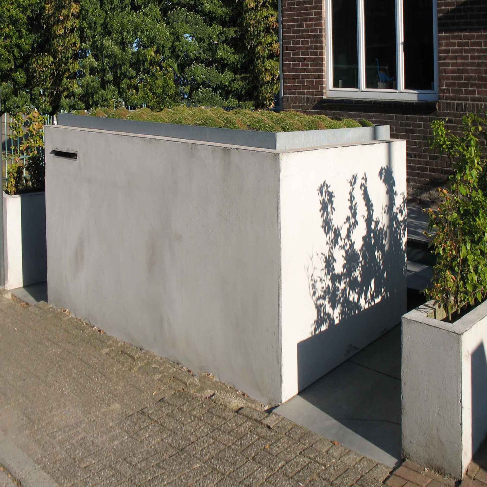 De fietsenberging in de voortuin is gesloten aan de straat zijde en met schuifdeuren te openen aan de tuinzijde. Achter de schuifdeuren aan de zijkant staan de groen- en vuilcontainers en de papierbak. Verder is er plek voor een regenton waar het groendak op is aangesloten. Ook de brievenbus is vanachter de schuifdeuren bereikbaar.