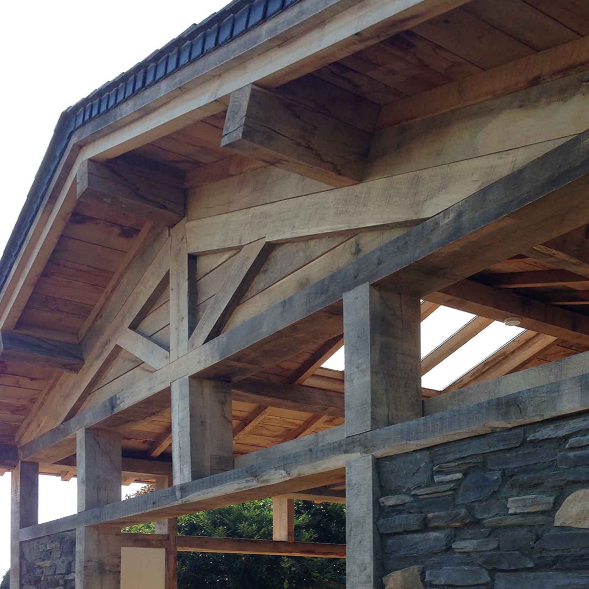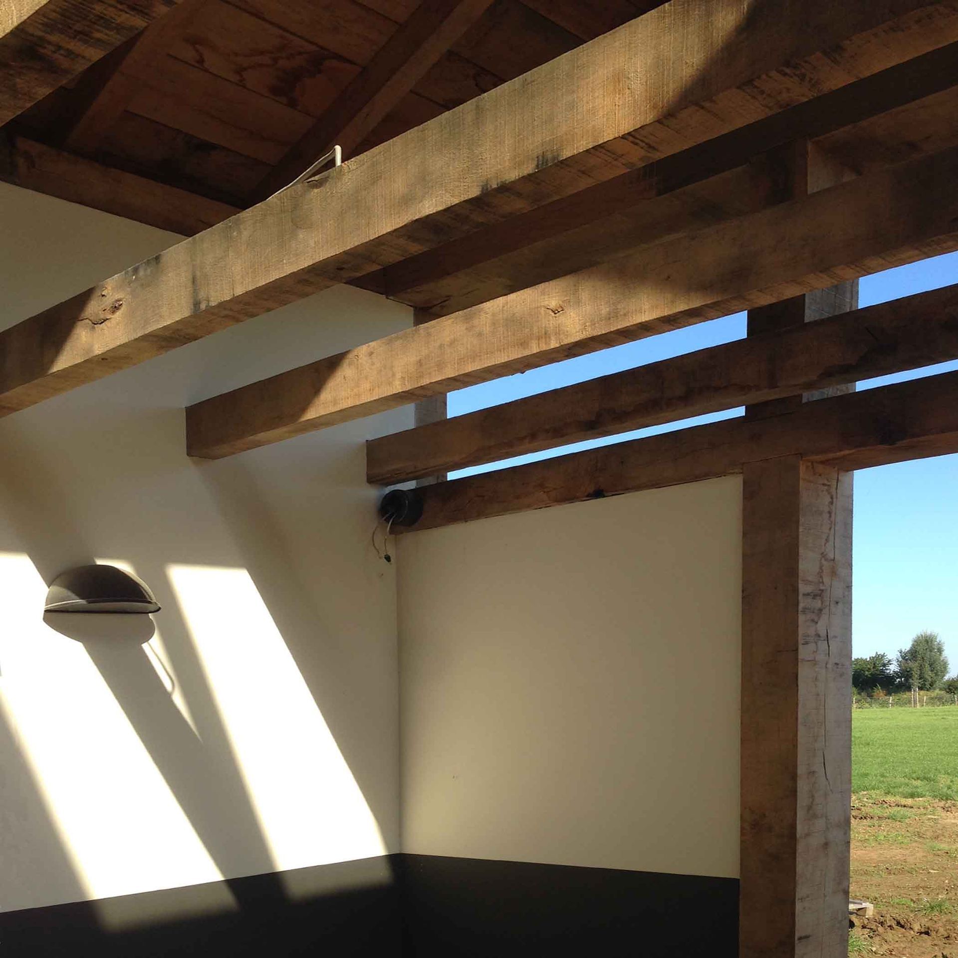 Deze mooie paardenstal staat op de grens van de achtertuin en de paardenwei. De wens van de opdrachtgevers was om er een mooi gebouw van te maken met pure natuurlijke materialen. Deze eikenhouten vakwerkconstructie is opgevuld met leistenen. Het dak is bekleed met leien.