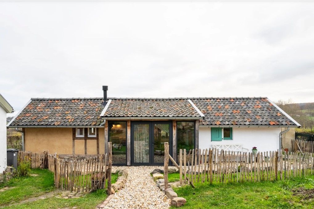 Deze kopgevelwoning is gerestaureerd en in de lengte uitgebreid richting het mooie heuvellandschap. De aanbouw is een houtskeletconstructie met een afwerking van zwart gebeitste houten gevelplanken.