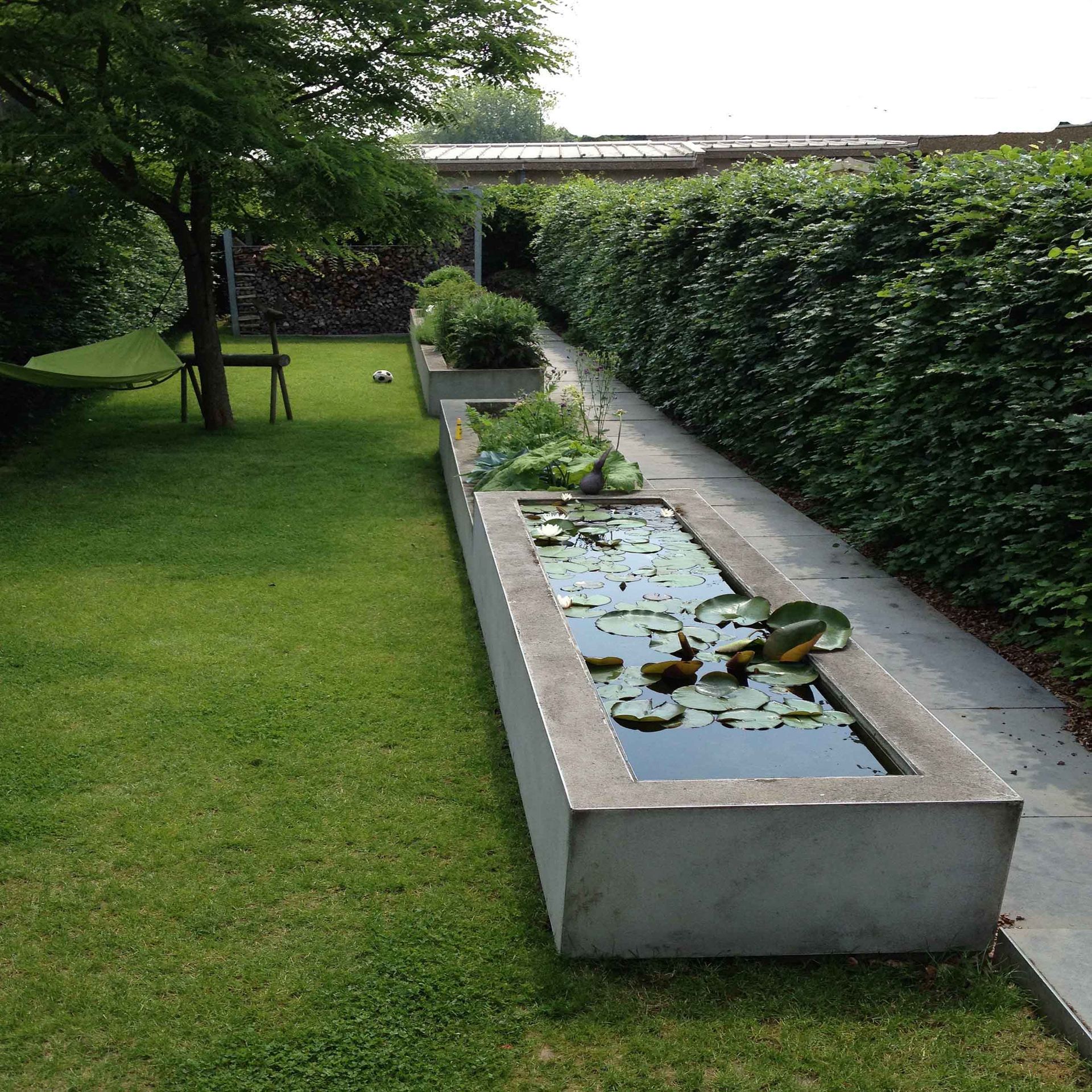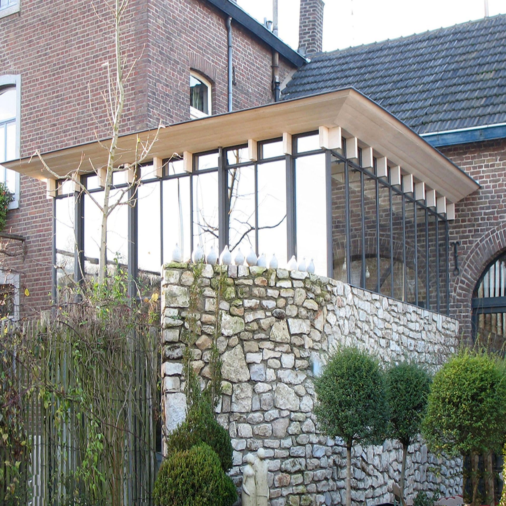 Deze tuinkamer bestaat uit een staalconstructie met stalen kozijnen. De houten balken zijn aan de staalconstructie opgehangen en dragen het paviljoenvormig dak. De tuinmuur van mergelstenen vormt een mooie afscheiding tussen de privetuin en de tuin van bloembinderij De Ridder.