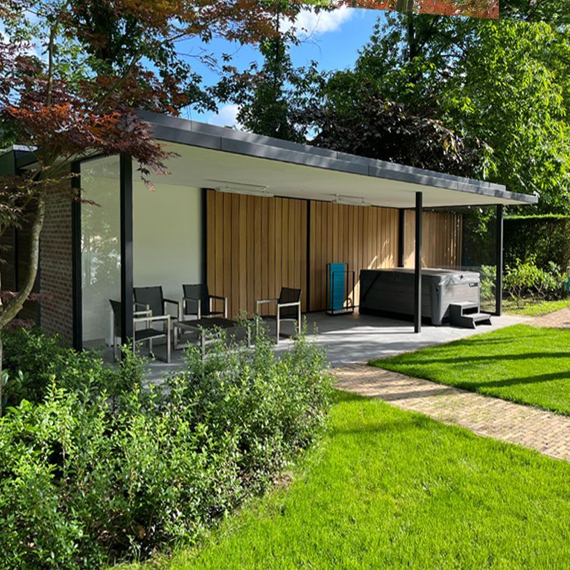 Het met aluminium bekleed overstekend dak geeft een ruimtelijk zwevend effect. Tussen de dragende stalen kolommen zijn glasplaten geplaatst die de fijne zitplek beschut tegen de wind en regen. Achterr de schuifdeur zit een keuken met bar met bar vestopt.