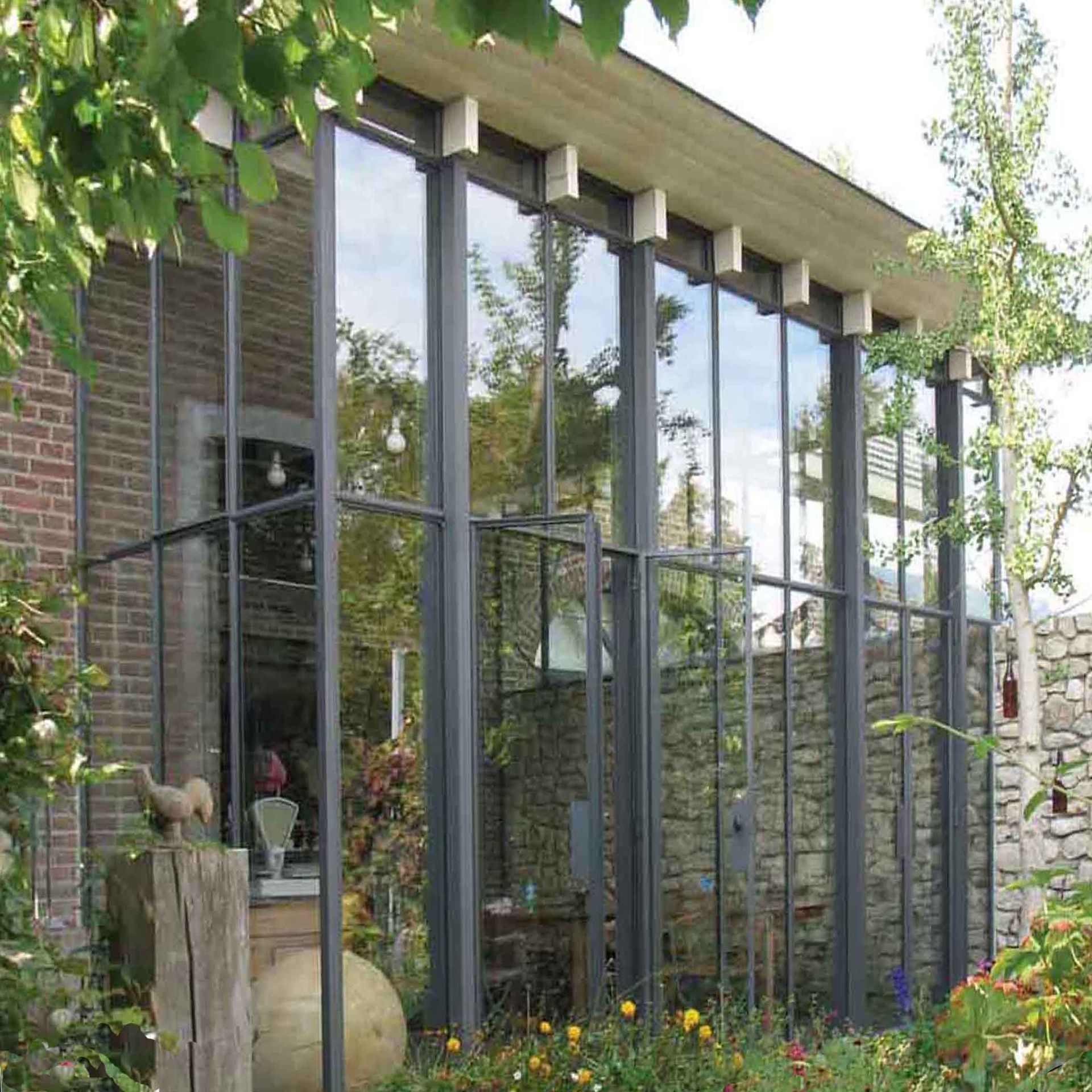 De tuinkamer is een mooie overgang van de woonkamer naar de tuin. Het zinken lessenaarsdak sluit aan op de dakvorm van het woonhuis. De eikenhouten constructie zorgt voor een warme uitstraling en een open karakter. De aluminium steellook benadrukken deze open tuinkamersfeer.