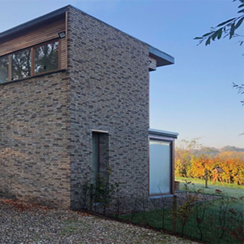 Een apart uitnodigend woonhuis ontworpen rondom een hoge, open, lichte woonruimte met ramen gericht op het landschap. De slaap en werkkamer bevinden zich in het koele souterrain dat mooi aansluit op de tuin.