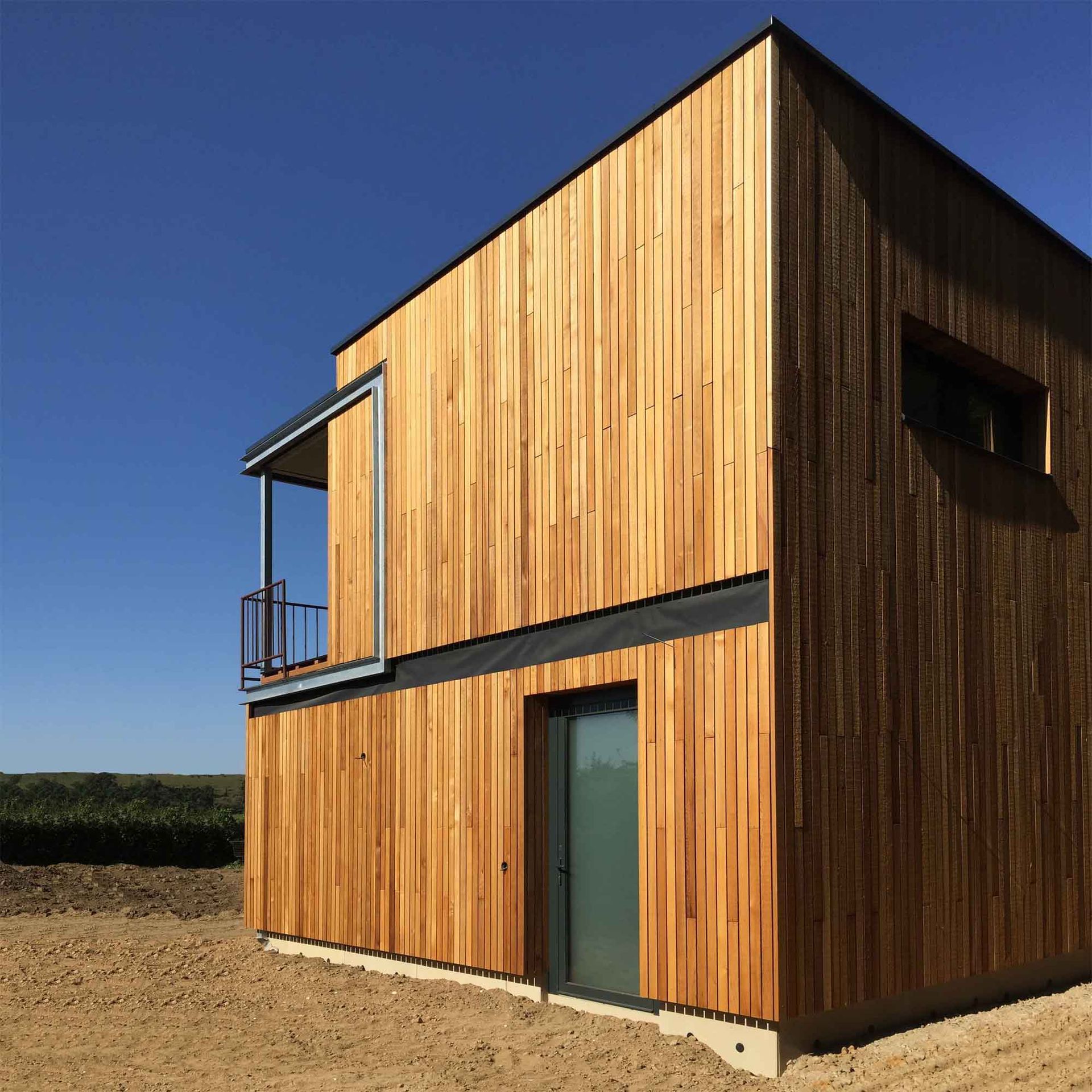 Het woonhuis in Mesch heeft de opzet van een Tiny house. Het hoofdvolume bestaat uit een houtskelet geïsoleerd met cellulose en afgewerkt met leemstukwerk. Het zitgedeelte is vormgegeven door een uitbouw in eiken vakwerk. Door houten puien aan de binnenzijde van dit vakwerk zullen er geen kieren ontstaan wanneer het eikenhout gaat werken.