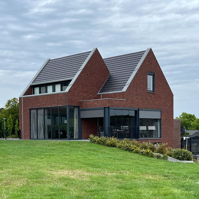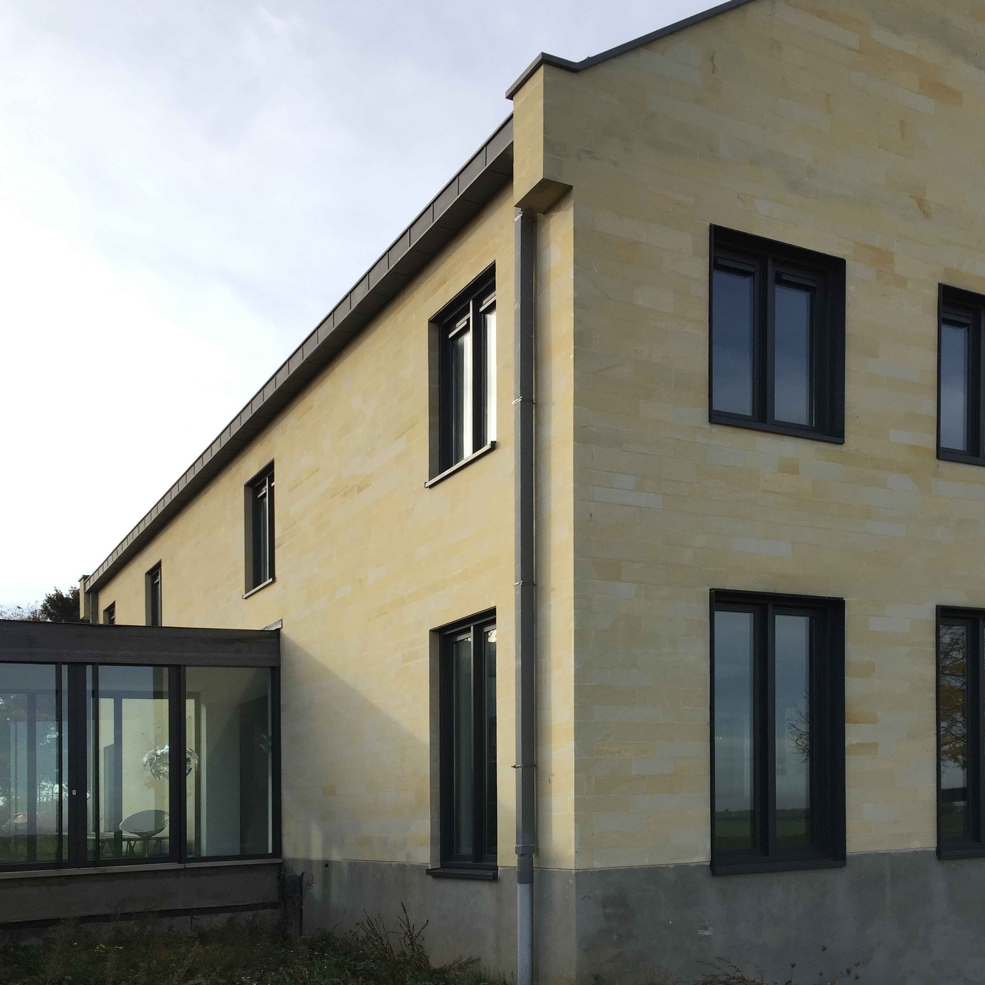 De vorm en uitstraling van het huis is gebaseerd op het mergelhuis dat er oorspronkelijk stond. De gevel is dan ook bekleed met mergel en afgewerkt met zink. Steellook aluminium kozijnen zorgen voor een mooi contrast.