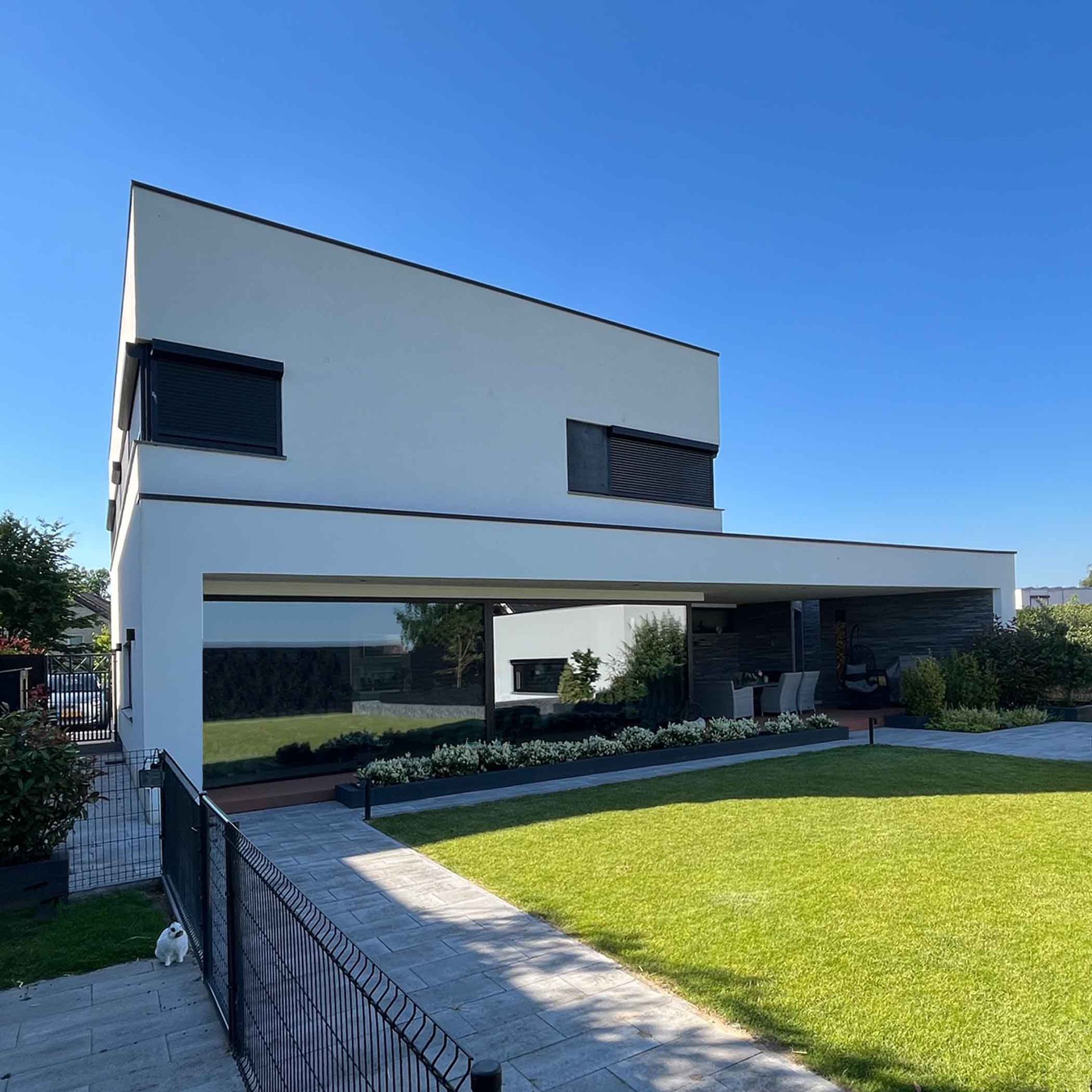 Deze strakke witgestuukte carport vormt tevens een overkapping van het tuinterras. In de gegalvaniseerde stalen kaders zijn de panelen van gebeitst iepenhout (deels) verdraaiend geplaatst zodat er doorzichten naar het landschap en de binnentuin ontstaan. De schuifpoort naar de carport schuift electrisch achter een vaststaand paneel.