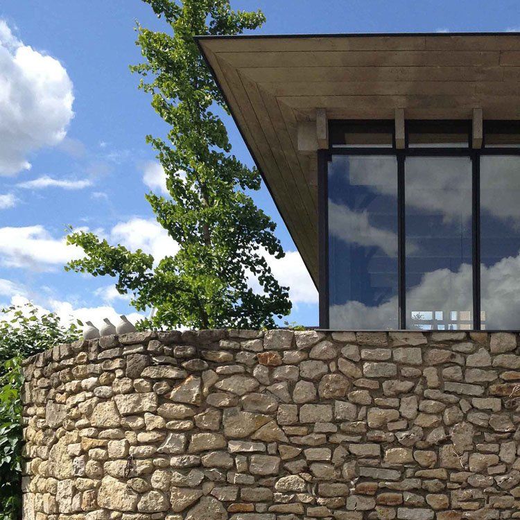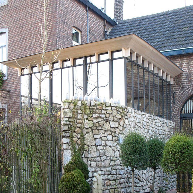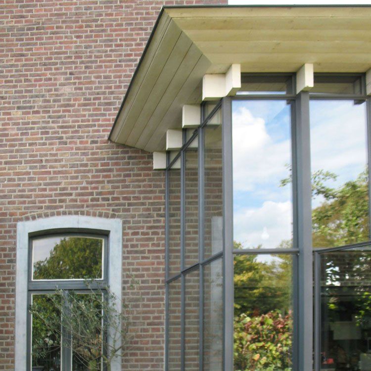 Bloembinderij de Ridder wenste een tuinkamer passend bij het bestaande woonhuis. Mergelstenen gecombineerd met stalen kozijnen maken een mooie verbinding met het groen en het huis.