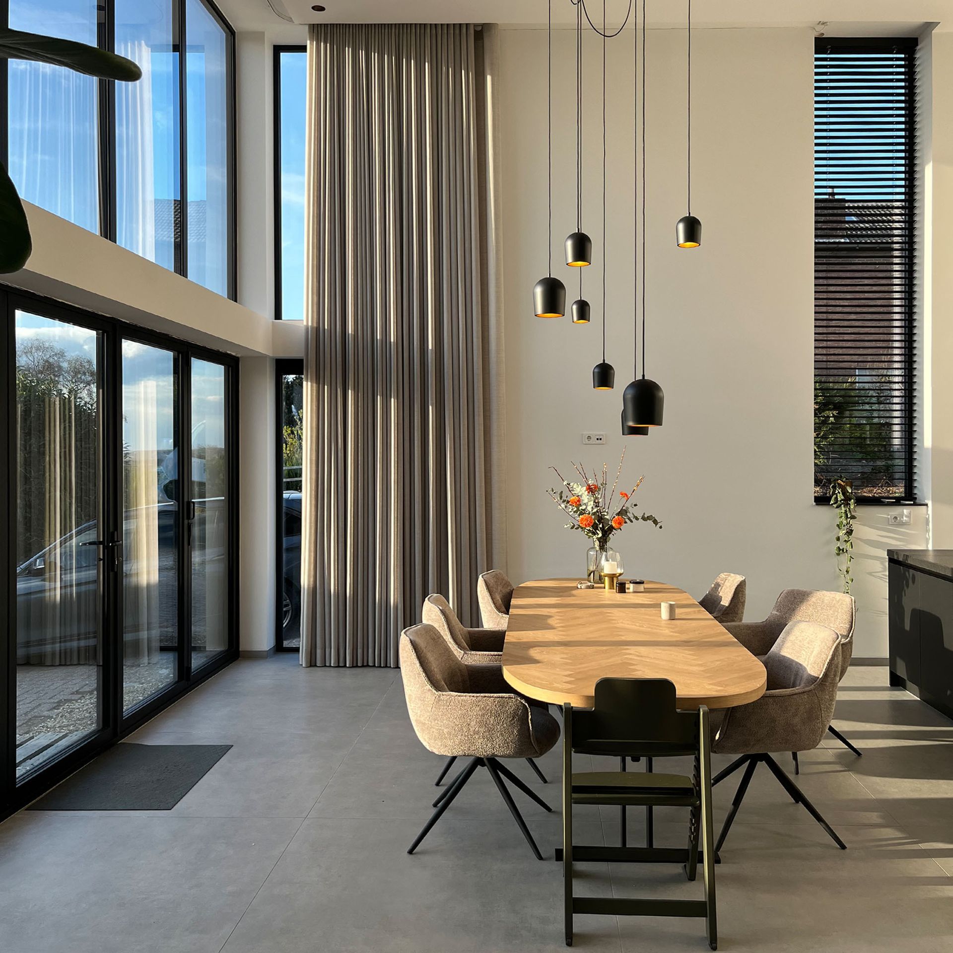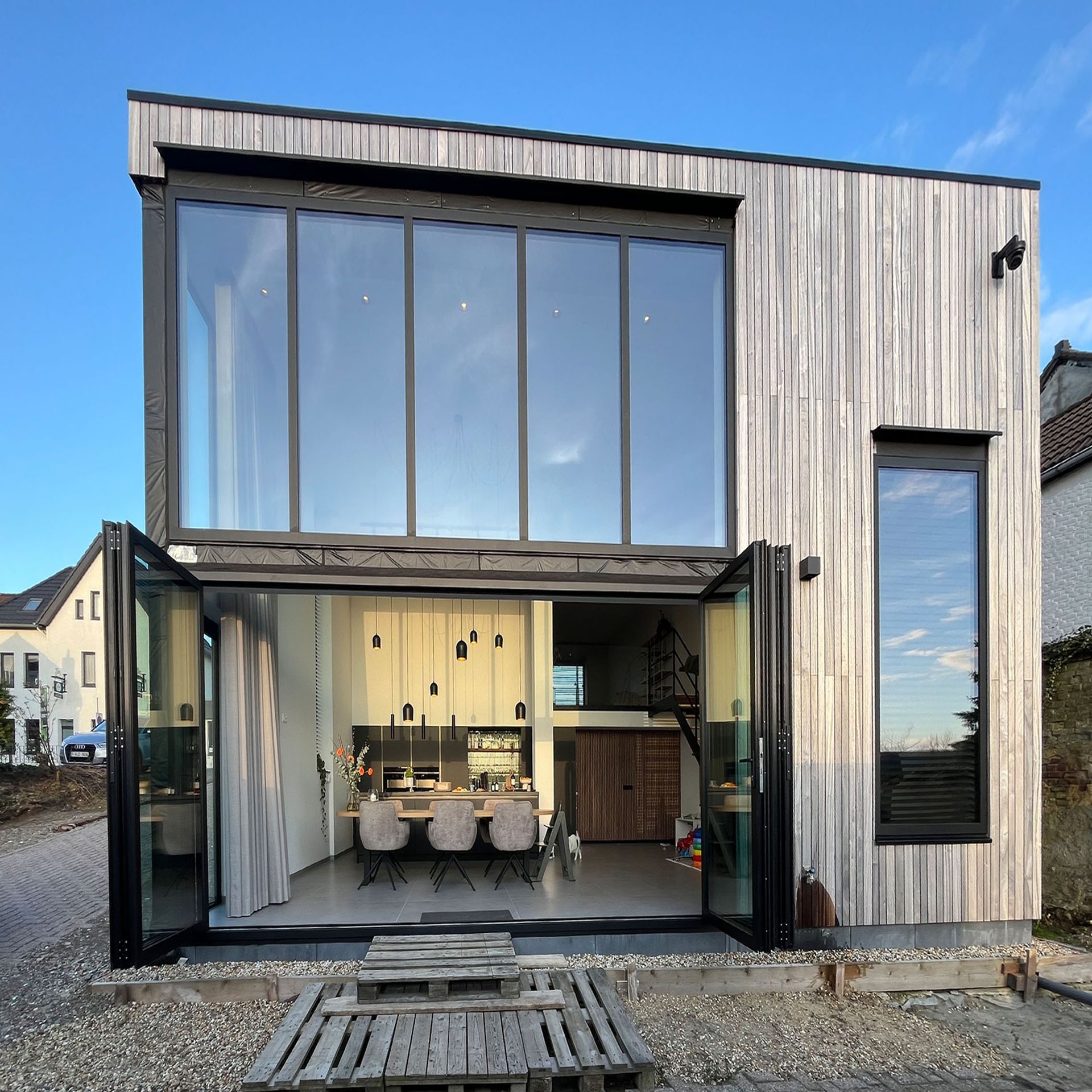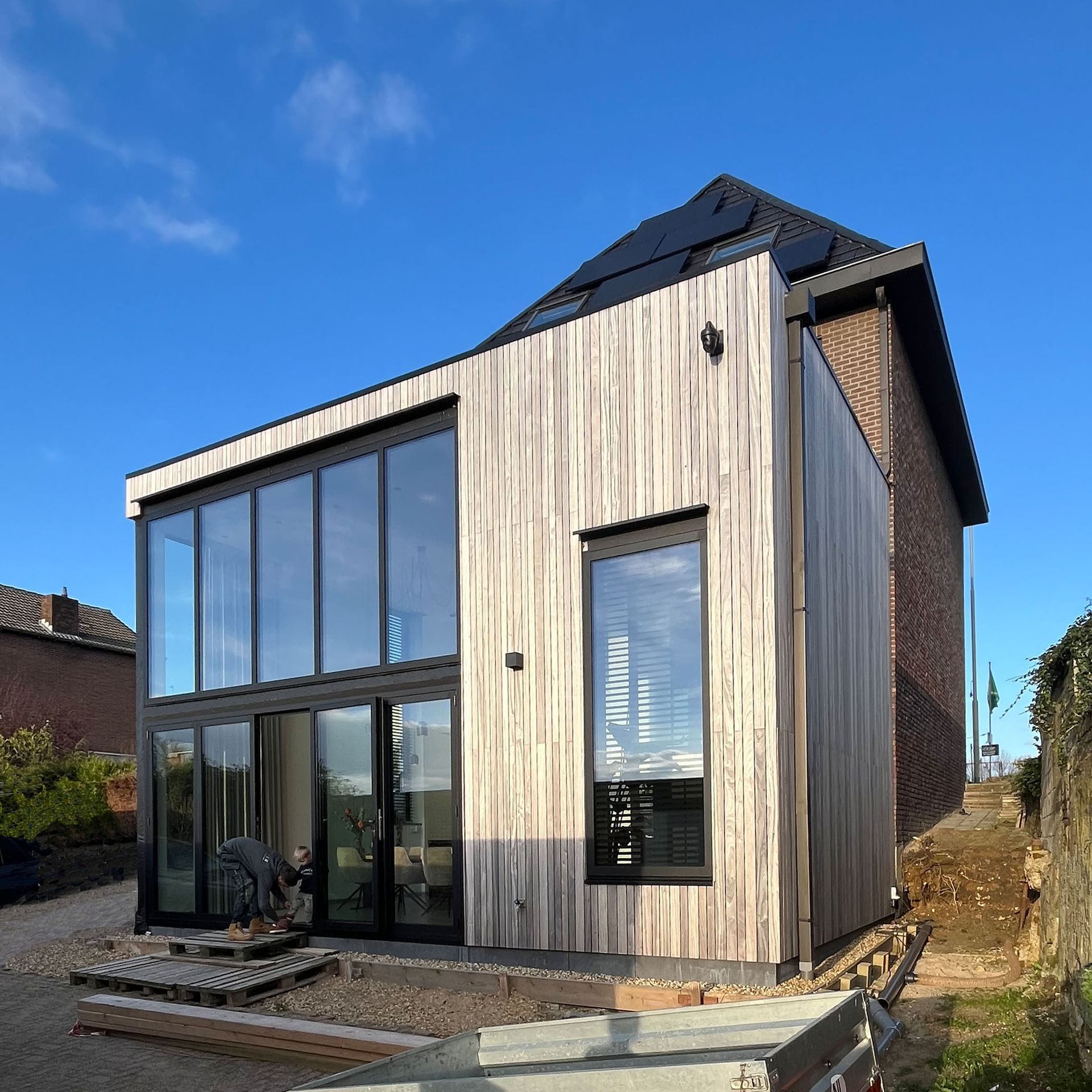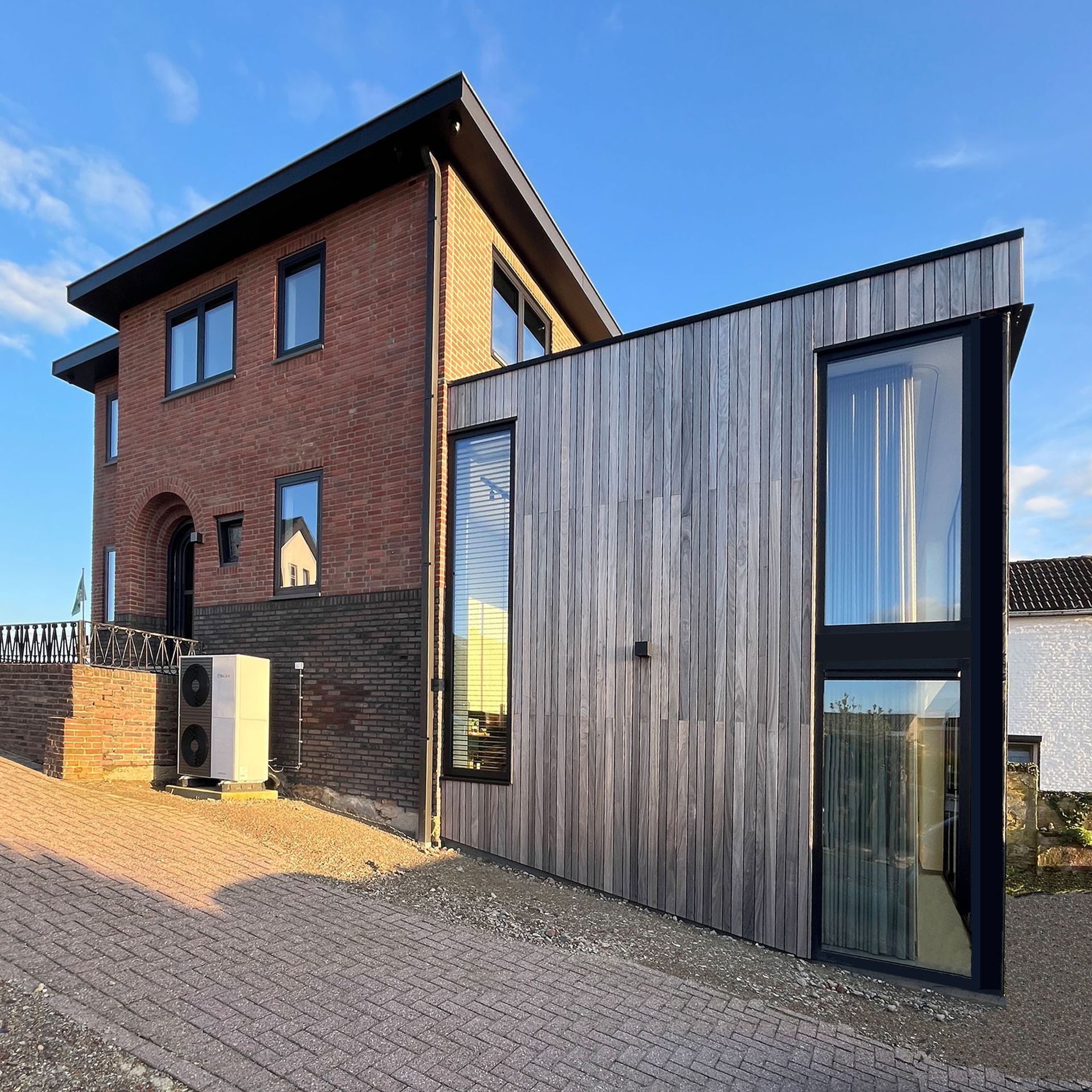 Het woonhuis Vijlenberg 26 ligt op een talud met schitterend uitzicht over de Limburgse heuvels. Door de aanbouw met keuken op kelderniveau te realiseren sluit de eetkamer mooi aan op de tuin